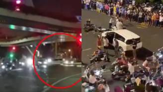 轿车失控撞伤多人,如离弦之箭冲入车丛